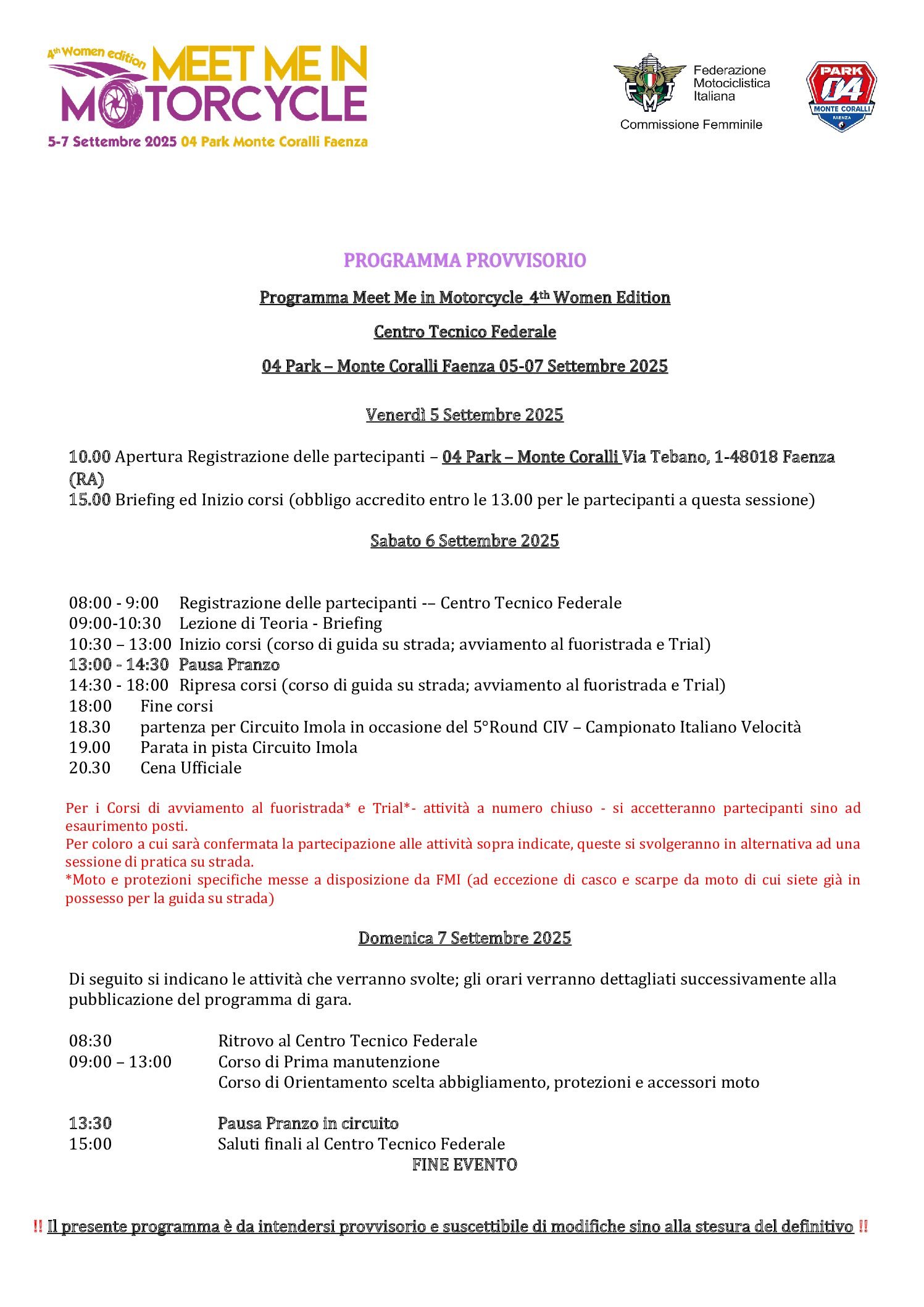 Dopo il successo delle prime tre edizioni, la Commissione Femminile FMI annuncia il quarto appuntamento con Meet Me In Motorcycle, che si terrà dal 5 al 7 Settembre 2025 a Faenza, precisamente allo 04Park – Monte Coralli, dove sorge anche il Centro Tecnico Federale.