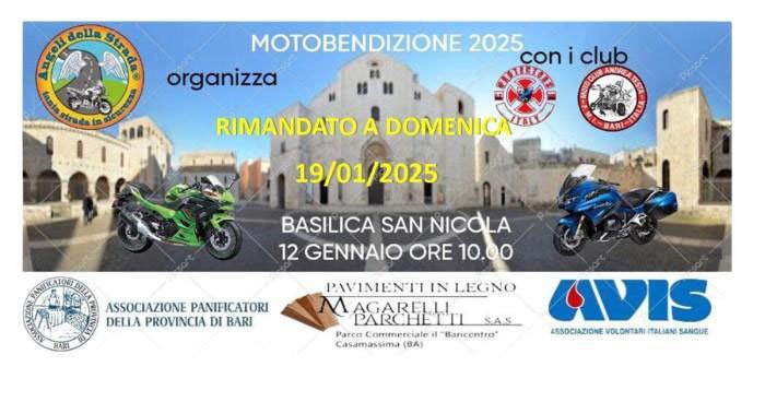 Domenica 19 gennaio 2025 si terrà la VII° edizione della MOTOBENEDIZIONE presso la Basilica di San Nicola a Bari con la partecipazione di moto club, associazione motociclistiche, biker, club, e tanti motociclisti che come ogni anno si ritrovano per dare inizio alla attività sportiva dell’anno con la benedizione del Signore.