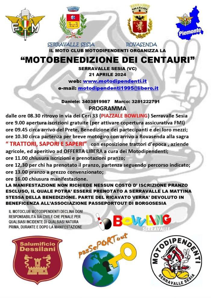 LA MANIFESTAZIONE NON RICHIEDE NESSUN COSTO D’ ISCRIZIONE PRANZO ESCLUSO, IL QUALE POTRA’ ESSERE PRENOTATO A SERRAVALLE LA MATTINA STESSA DELLA BENEDIZIONE. PARTE DEL RICAVATO VERRA’ DEVOLUTO IN BENEFICENZA ALL’ASSOCIAZIONE PASSEPORTOUT DI BORGOSESIA
