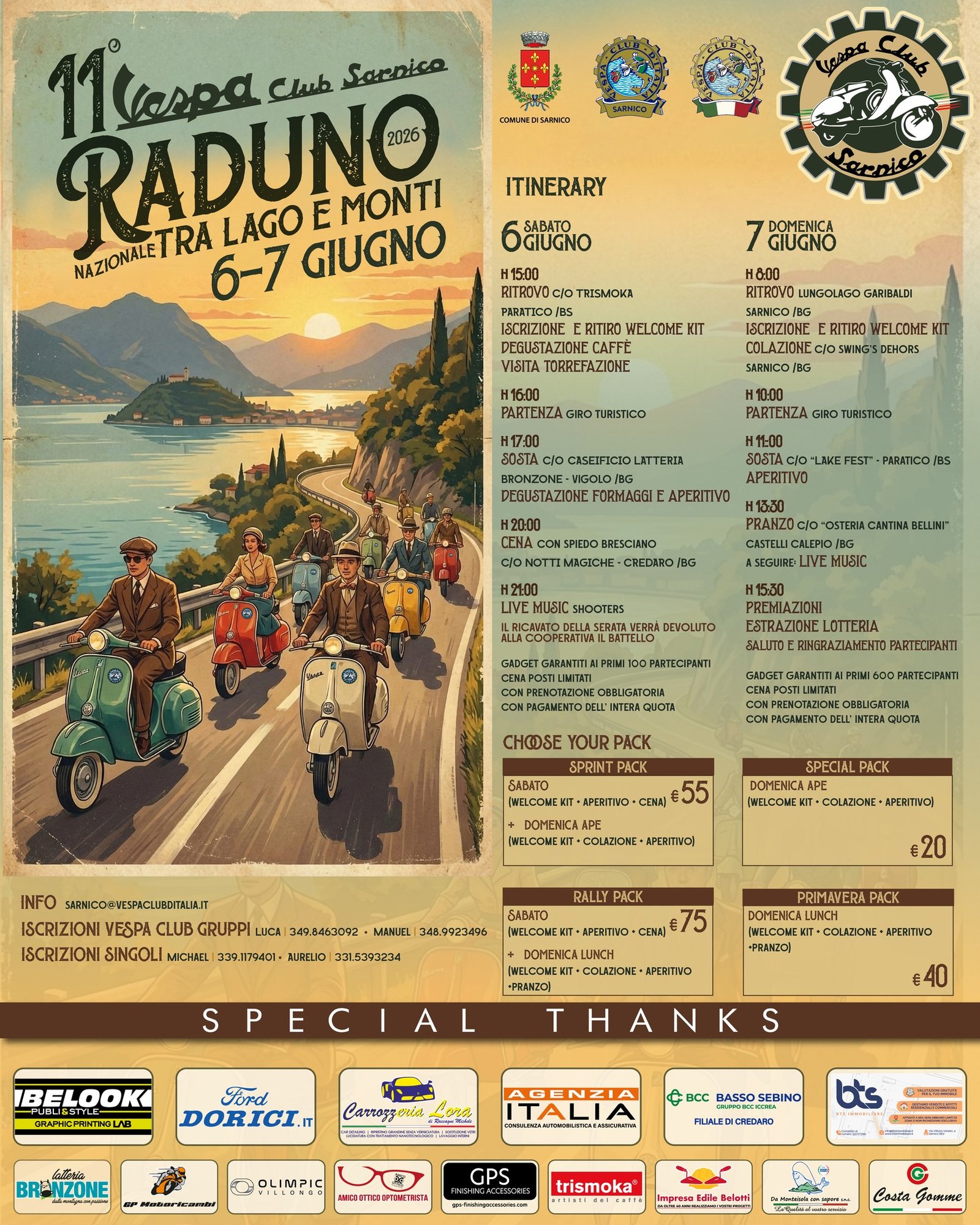 Bergamo Lombardia, Bergamo, BG, Italiasarnico@vespaclubditalia.it 11° RADUNO NAZIONALE – TRA LAGO E MONTI Scaldate i motori e preparate le miscele: l’attesa è finita! Vi presentiamo la locandina ufficiale del 11° […]