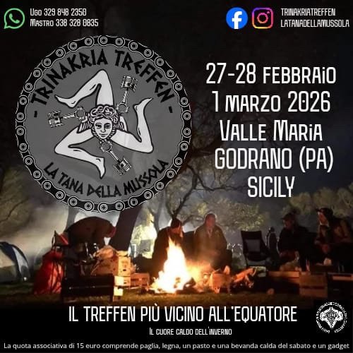 tanadellamussola@gmail.com Trinakriatreffen 2026 – Il raduno invernale più vicino all’Equatore! Dal 27 febbraio al 1 marzo 2026, il Bosco di Ficuzza (Valle Maria – Godrano, PA) […]