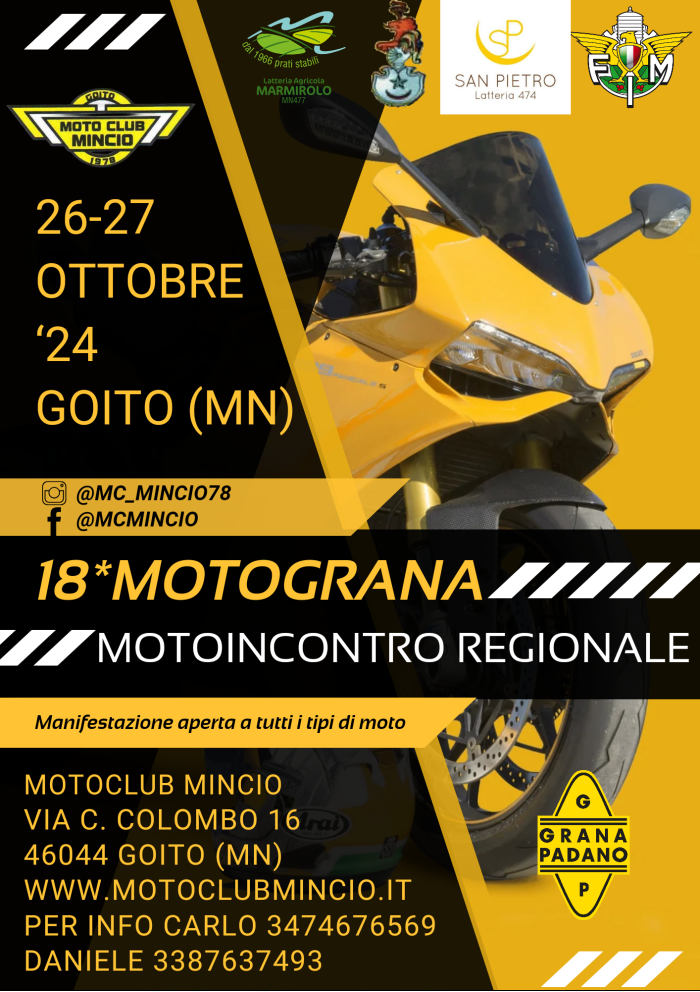 Organizzatore: MOTOCLUB MINCIO A.S.D. mcmincio@gmail.com **CAUSA MALTEMPO EVENTO POSTICIPATO AL 26-27 OTTOBRE 2024** MOTOINCONTRO REGIONEALE aperto a tutti i tipi di moto nel territorio delle colline […]