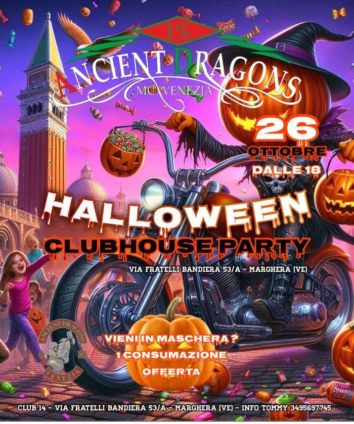 Organizzatore: Ancient Dragons MC Venezia ancientdragonsmc@gmail.com Serata Chili ! Per chi viene mascherato una consumazione omaggio !
