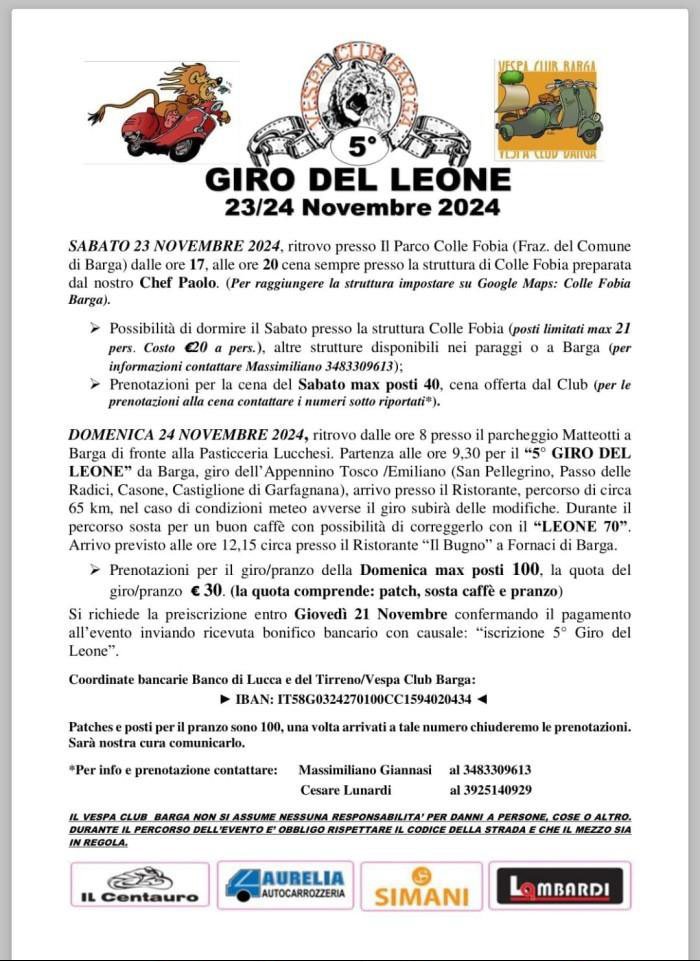 Organizzatore: Vespa Club Barga SABATO 23 NOVEMBRE 2024, ritrovo presso Il Parco Colle Fobia (Fraz. del Comune di Barga) dalle ore 17, alle ore 20 cena […]