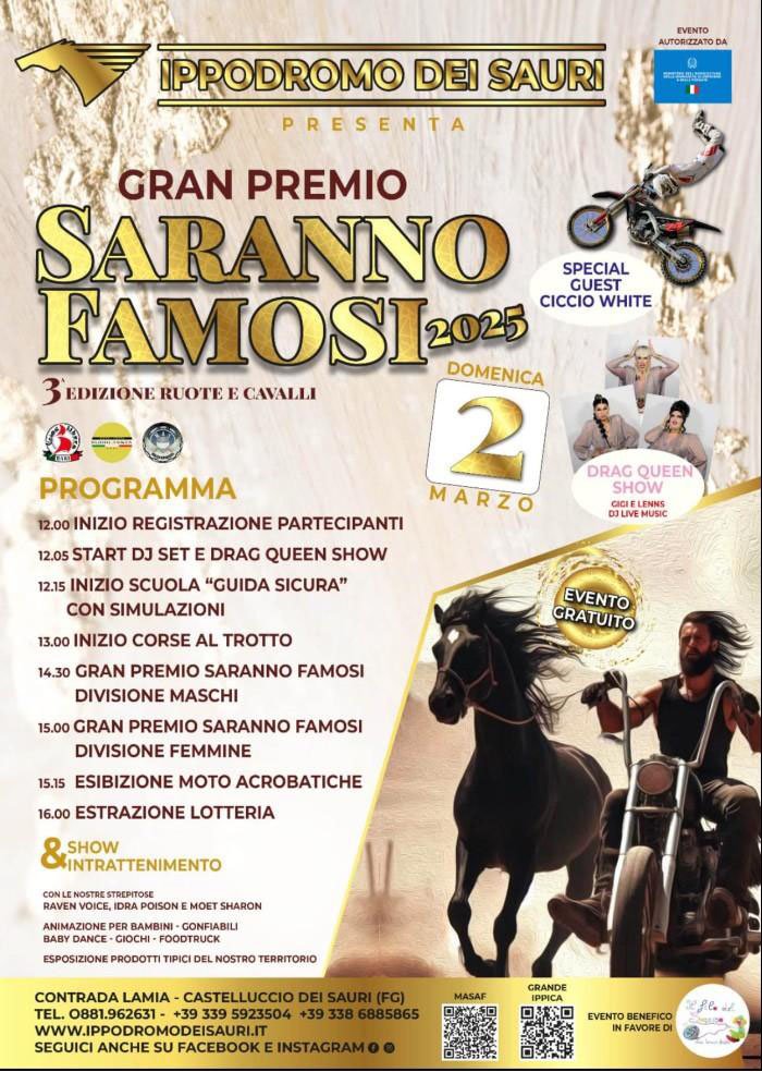 Organizzatore: IPPDROMO DEI SAURI PROGRAMMA 12.00 INIZIO REGISTRAZIONE PARTECIPANTI 12.05 START DJ SET E DRAG QUEEN SHOW 12.15 INIZIO SCUOLA "GUIDA SICURA" CON SIMULAZIONI 13.00 INIZIO […]