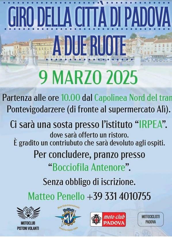 Organizzatore: M.C. Pistoni Volanti Partenza alle ore 10.00 dal Capolinea Nord del tram Pontevigodarzere (di fronte al supermercato Ali). Ci sarà una sosta presso l'istituto "IRPEA" […]