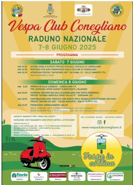 info@vespaclubconegliano.it PROGRAMMA SABATO 7 GIUGNO ORE 15,30 ACCOGLIENZA E RITROVO PRESSO PIAZZALE CASTELLO DI CONEGLIANO ORE 16,00 PARTENZA PER GIRO PANORAMICO SULLE COLLINE DI CONEGLIANO ORE […]