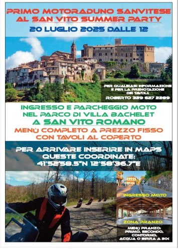 INGRESSO E PARCHEGGIO MOTO NEL PARCO DI VILLA BACHELET A SAN VITO ROMANO MENÙ COMPLETO A PREZZO FISSO CON TAVOLI AL COPERTO