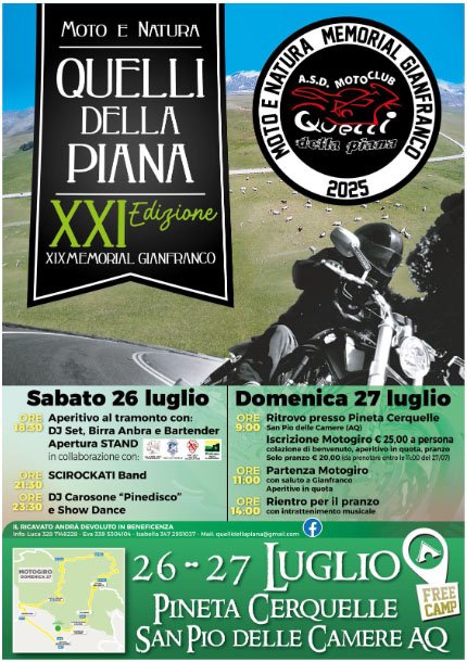 L'Aquila Abruzzo, L'Aquila, AQ, ItaliaRaduno gratuito di moto. Pernottamento e cena all’aperto. E’ necessario essere muniti di: Tenda, Sacco a pelo caldo, salsicce e tutto ciò che serve per il […]