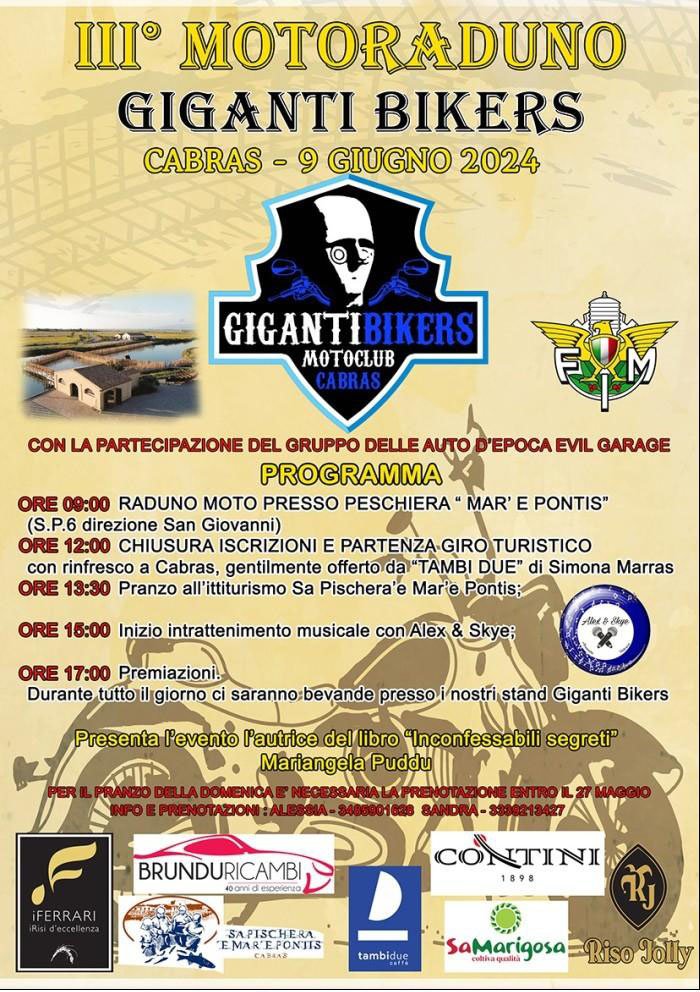 Organizzatore: Motoclub Giganti Bikers giulianacontini71@gmail.com ORE 09:00 RADUNO MOTO PRESSO PESCHIERA "MAR' E PONTIS" (S.P.6 direzione San Giovanni) ORE 12:00 CHIUSURA ISCRIZIONI E PARTENZA GIRO TURISTICO […]