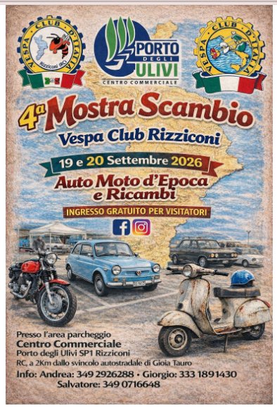 19 Settembre - 20 Settembre 4^ MOSTRA SCAMBIO RIZZICONI 2026 Motoraduno Rizziconi Reggio Calabria Reggio-Calabria Calabria, Reggio-Calabria, RC, Italia Auto Moto d’Epoca e Ricambi INGRESSO GRATUITO PER VISITATORI